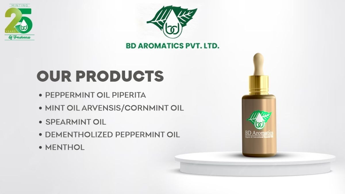 “At B.D. Aromatics Pvt. Ltd., we are driven by a belief that our success is intertwined with environmental responsibility and community well-being. Through our dedication to organic production and sustainable practices, we aim to create a better future for all. Join us in experiencing the B.D. Aromatics difference, where excellence meets integrity in every drop of our organic and conventional mint oils and aroma chemicals.”