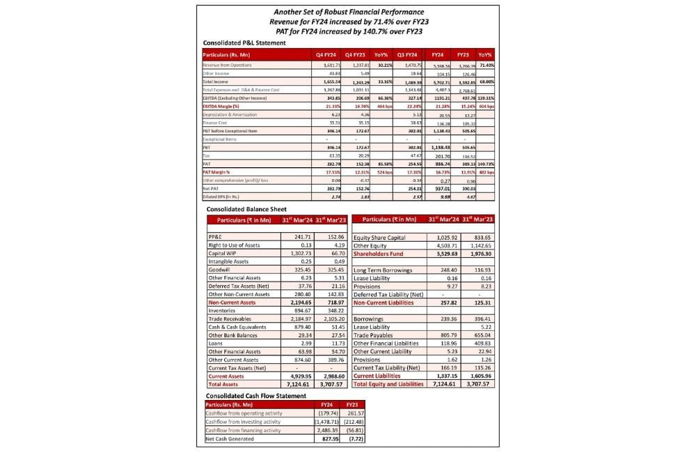 “We are happy to share our financial and business performance for FY24, we registered robust revenue growth of 71.40% and revenue from operations stood at ₹5,598.56 Mn in FY24 compared to ₹3,266.39 Mn in FY23 owing to our constant focus on client addition and continued demand for our specialized engineering products in the existing and new industries like railways, defense and heavy commercial vehicles. EBITDA grew by 139.31% and margins expanded by 604 bps from 15.24% in FY23 to 21.28% in FY24 owing to increase in scale of operations and increased demand for heavier products which tend to yield better margins. PAT margins improved by 482 bps from 11.91% in FY23 to 16.73% in FY24.