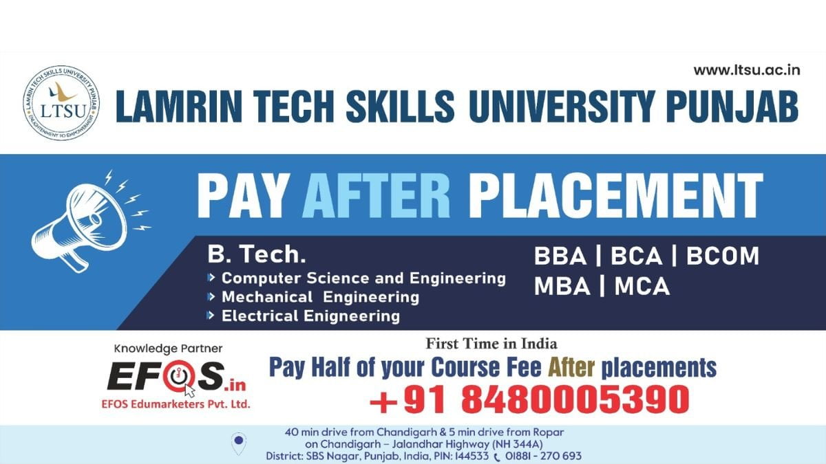 रोपड़, पंजाब, भारत: लेमरीन टेक् स्किल्स यूनिवर्सिटी ( Lamrin Tech Skills University ) ने इंजीनियरिंग, प्रबंधन और कंप्यूटर एप्लीकेशन ( B.Tech , BBA, BCA , MBA and MCA ) पाठ्यक्रमों में छात्रों के लिए एक क्रांतिकारी “प्लेसमेंट के बाद भुगतान ( Pay After Placements” कार्यक्रम शुरू करने की घोषणा की है। यह पहल छात्रों की आर्थिक चिंताओं को कम करने और शिक्षा को उनके लिए अधिक सुलभ बनाने की दिशा में एक महत्वपूर्ण कदम है।