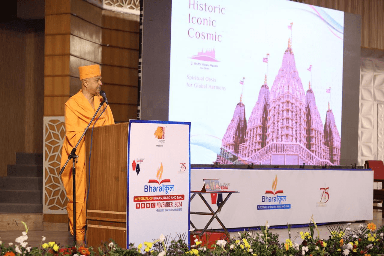 New Delhi [India] November 18: The BharatKool Festival, an initiative by the Gujarat Media Club to celebrate India’s rich cultural and intellectual heritage, concluded on an inspiring note with the valedictory address by Shri Brahmavihari Swami of the BAPS Swaminarayan Sanstha. Held at the Senate Hall of Gujarat University, the event was elevated by the spiritual leader’s profound wisdom and timeless message.