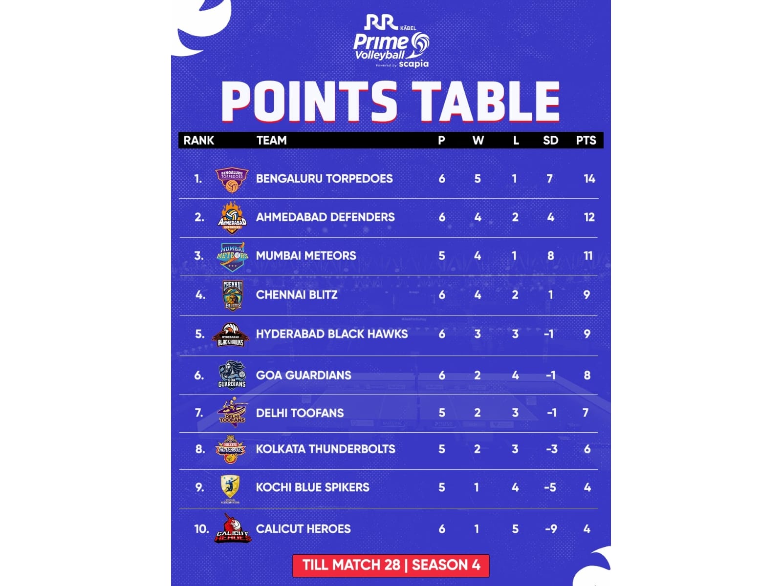 New Delhi [India], October 23: Ahmedabad Defenders stunned the unbeaten Mumbai Meteors in the RR Kabel Prime Volleyball League powered by Scapia at the Gachibowli Indoor Stadium, Hyderabad, on Saturday, winning the match 12–15, 15–7, 15–12, 21–20. Nandhagopal was named the Player of the Match. With this win, Ahmedabad Defenders climbed to the second position in the table with 12 points in six games, while the Meteors slipped to the third position.